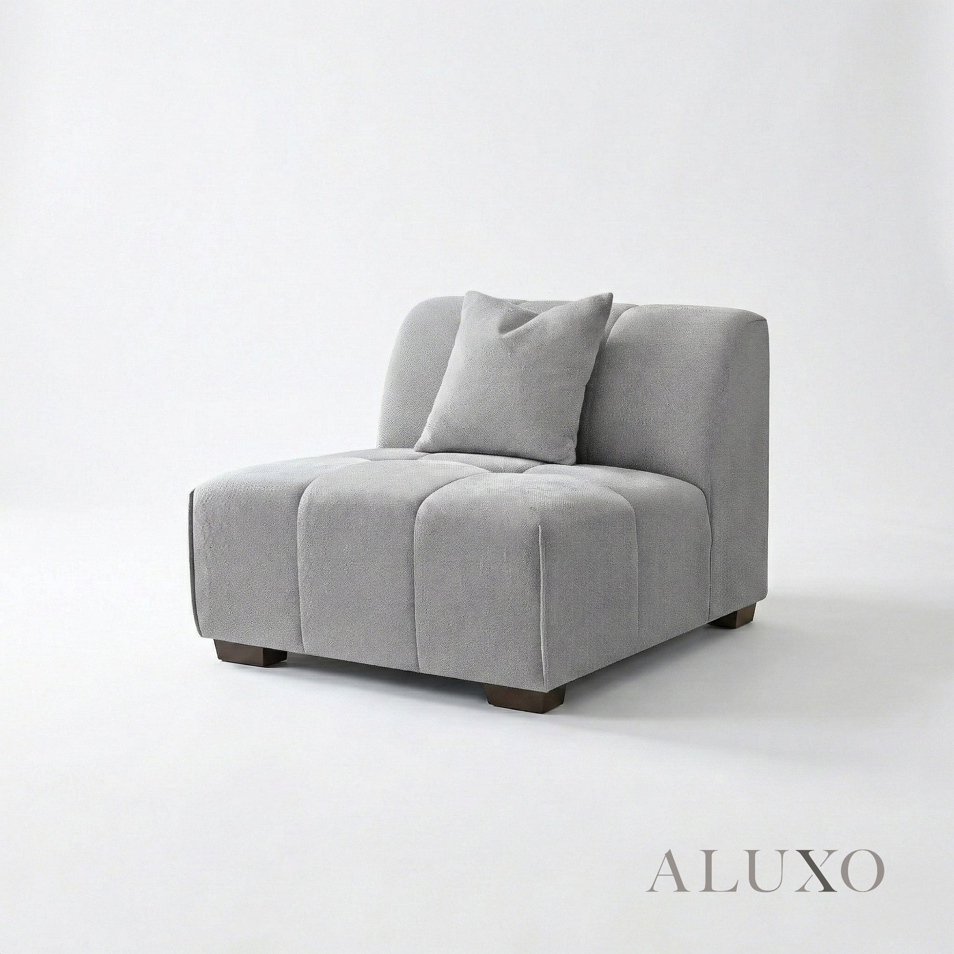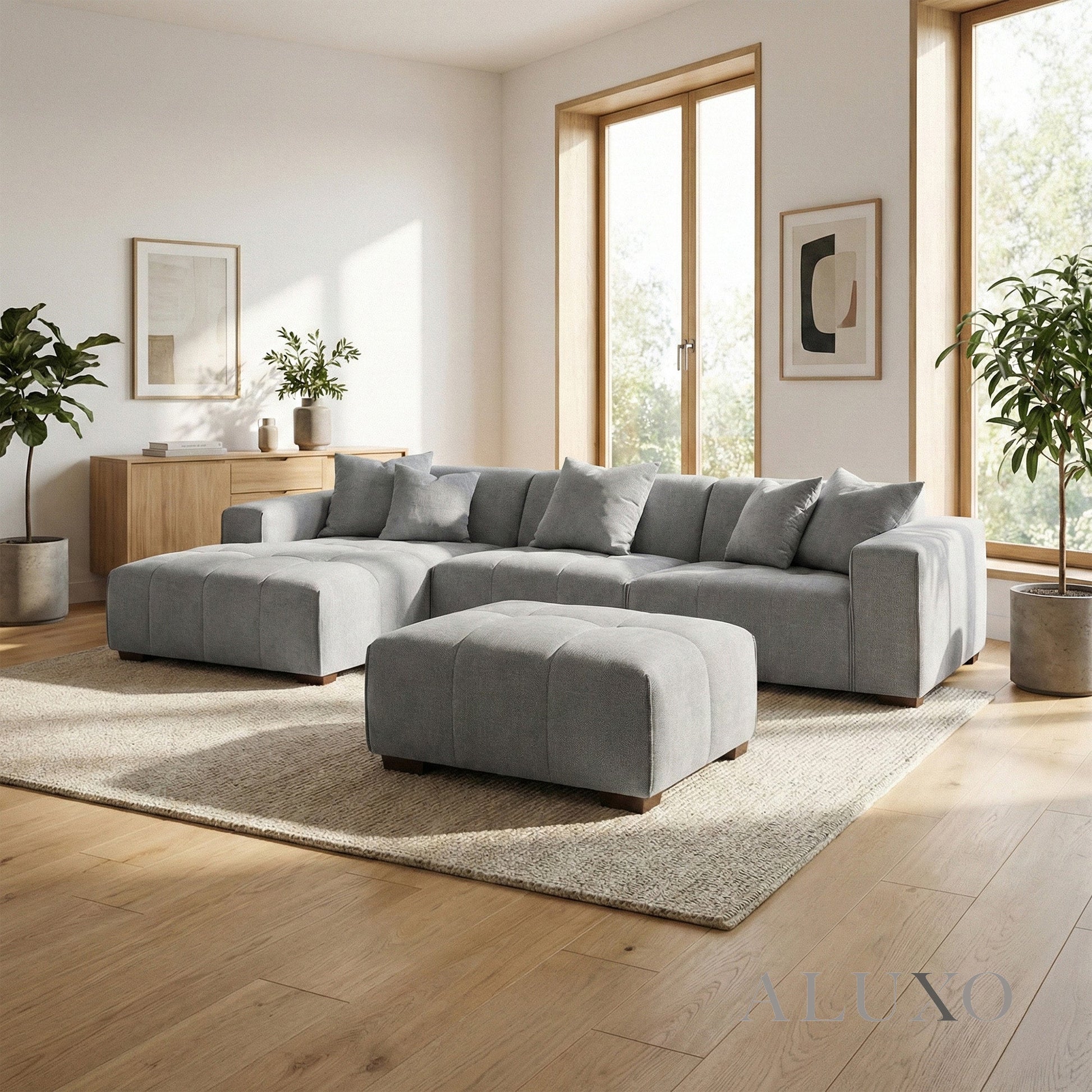 The ALUXO® Leonard Corner Sofa blends soft modern form with everyday function. Crafted with distinctive block-stitched seat cushions and upholstered in a tight-weave Cloudy Grey bouclé fabric, it creates a calm and inviting space to unwind. Built for long-lasting style, it features a robust wooden frame and premium high-density foam padding for a supportive feel. Aluxo-Track Aluxo-TrackCopy