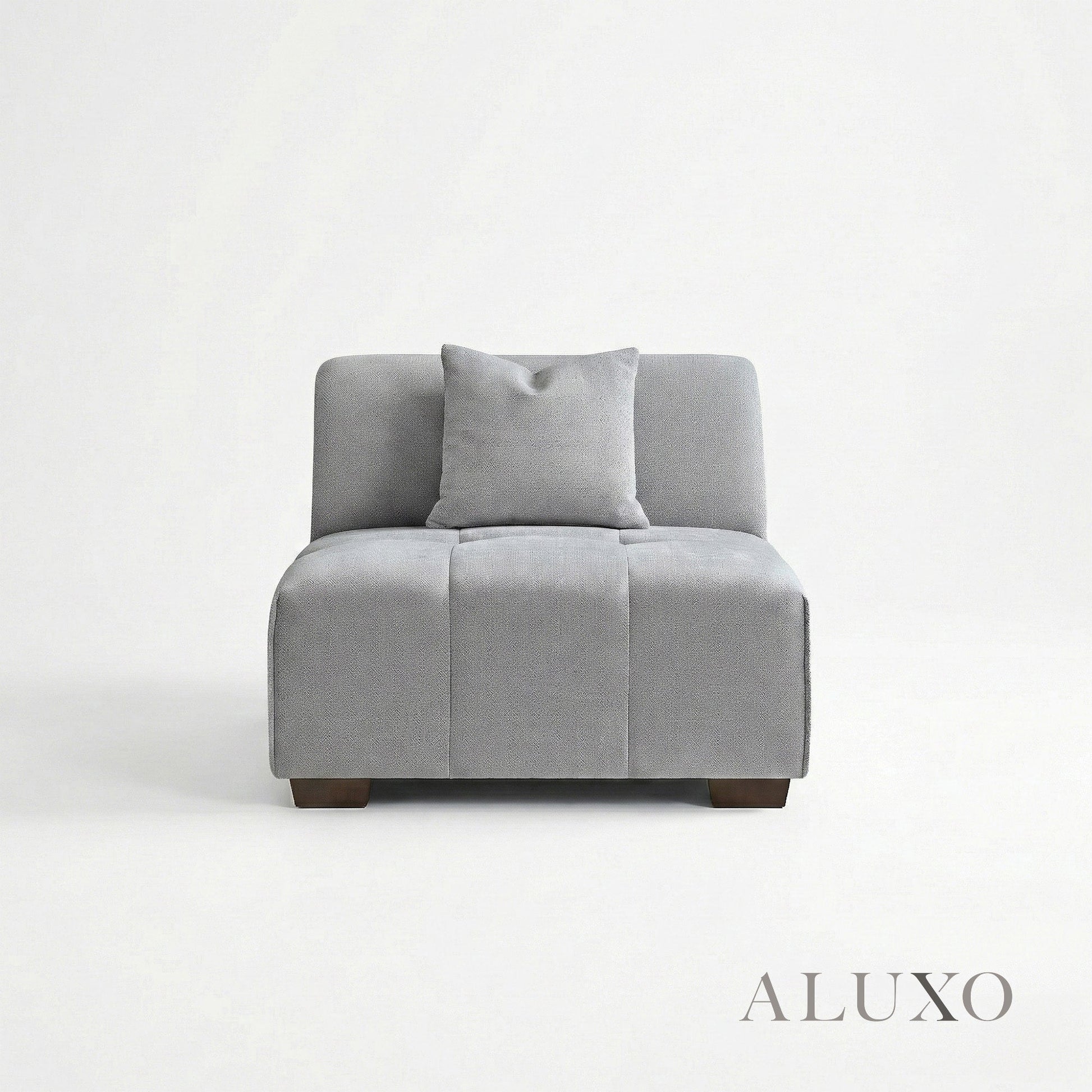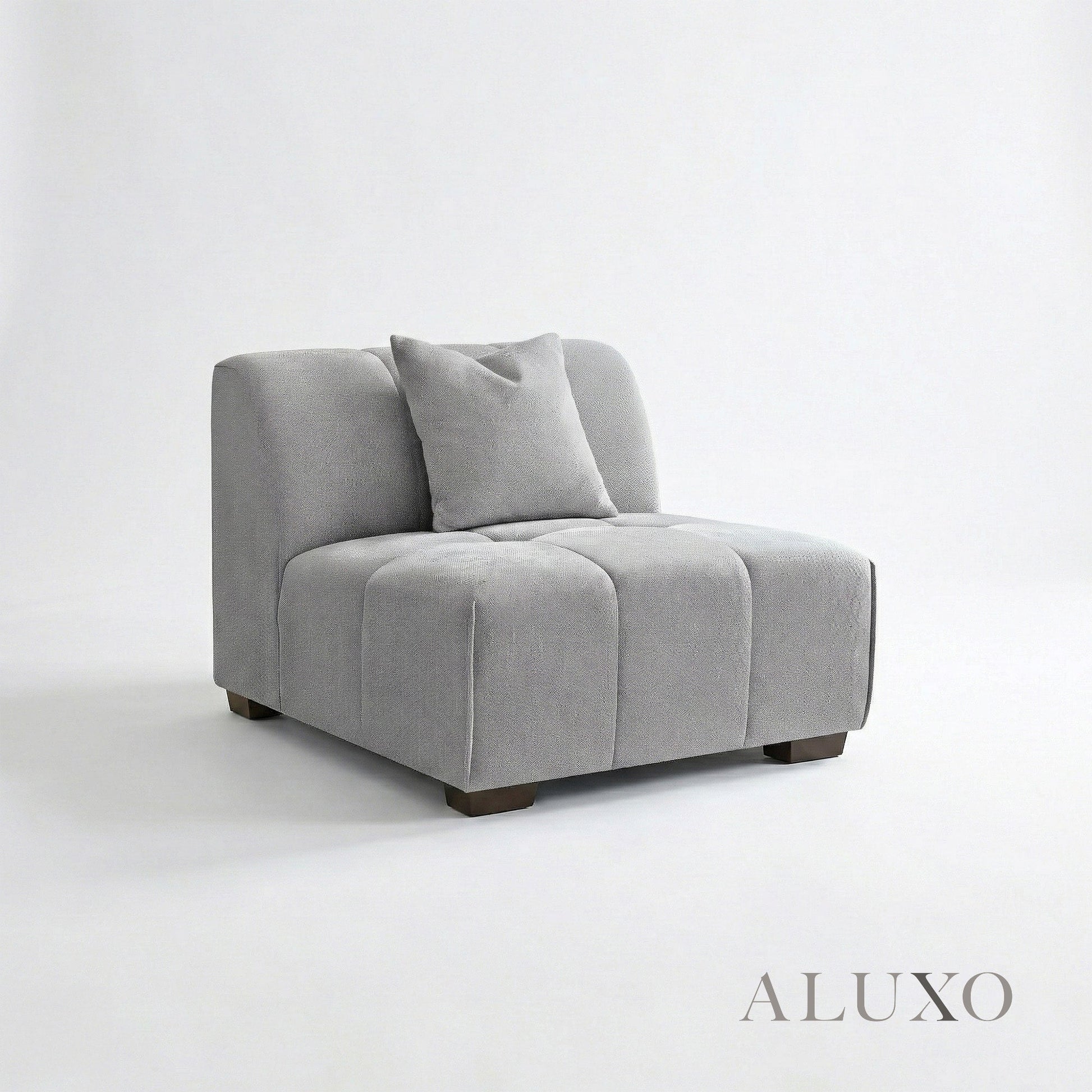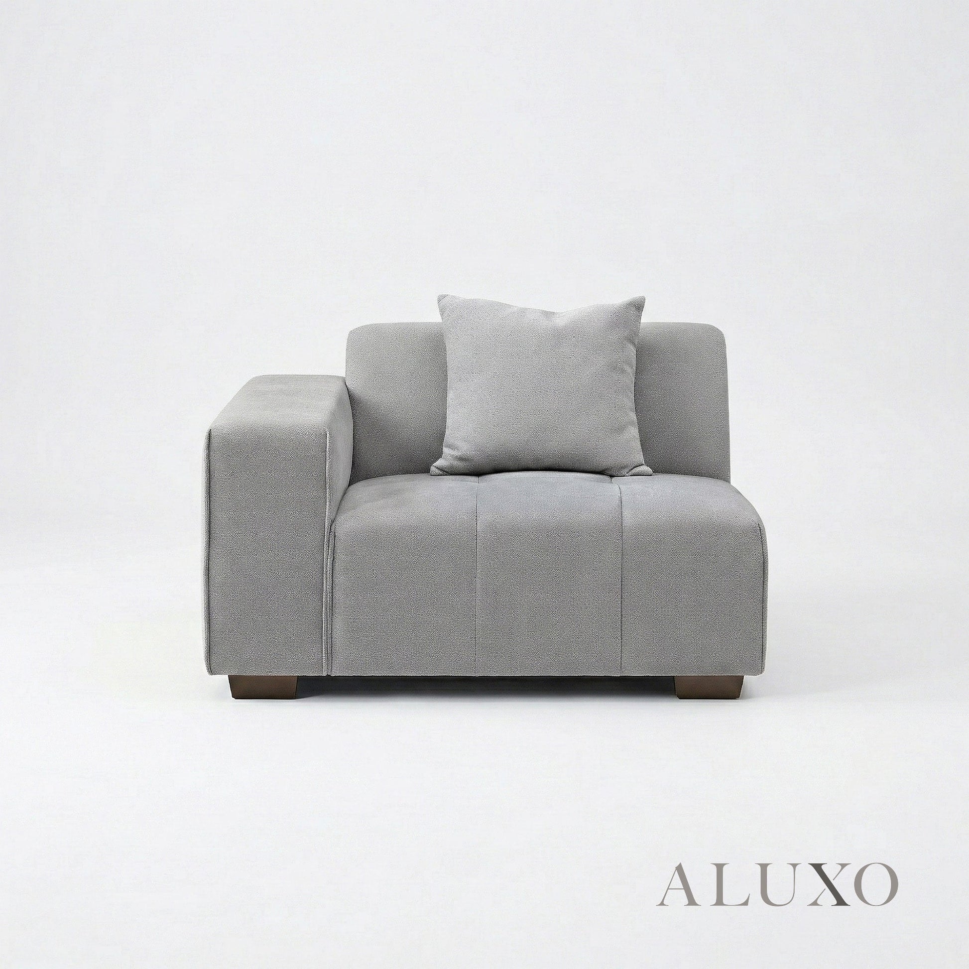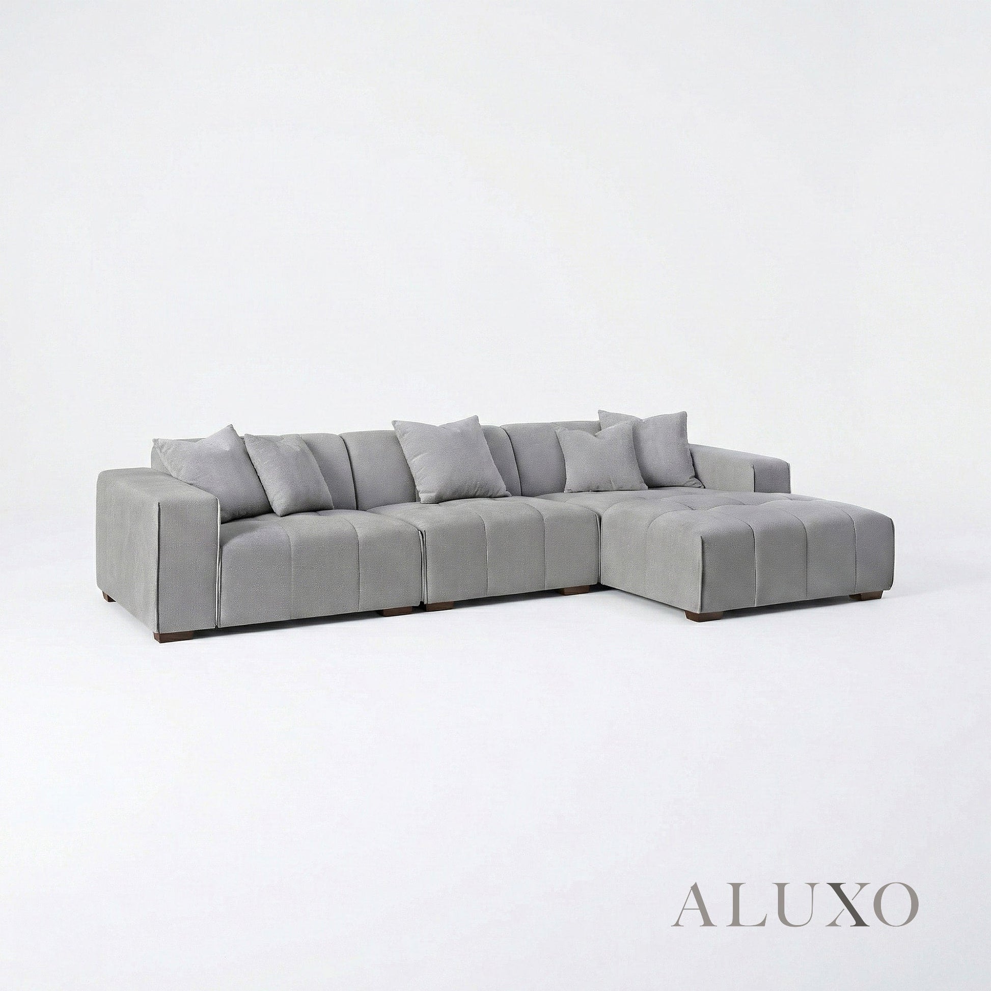 The ALUXO® Leonard Corner Sofa combines clean-lined comfort with versatile modular flexibility. Crafted with distinctive block-stitched seat cushions and upholstered in a premium Cloudy Grey tight-weave bouclé, this corner sofa offers a sophisticated architectural aesthetic. Built for long-term durability, it features a reinforced wooden frame and high-resilience foam padding, providing a supportive yet inviting feel. Aluxo-Track Aluxo-TrackCopy