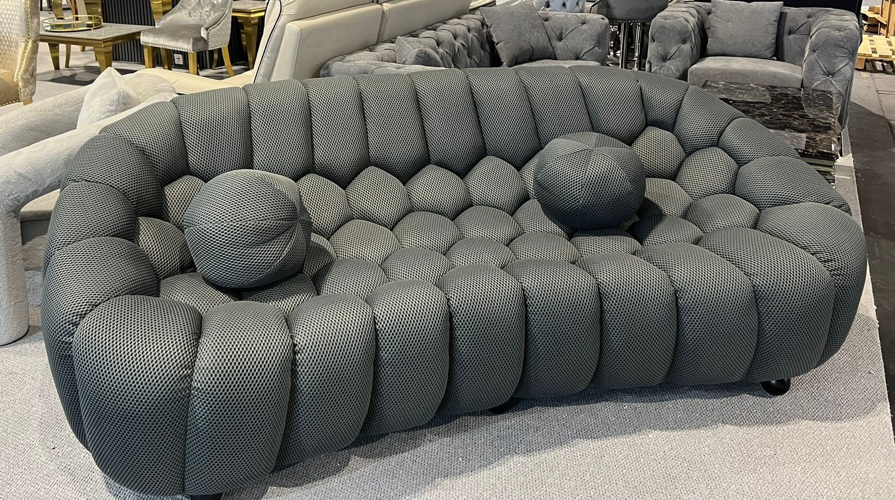 Introducing the Belle bubble Sofa in grey—a captivating blend of elegance and comfort. This gracefully curved sofa is a masterpiece of design, offering both a stunning aesthetic and a luxurious seating experience. Crafted with meticulous attention to detail, the Belle Sofa's distinctive curvature embraces a contemporary sensibility, while its ivory hue brings an air of sophistication to any space. Upholstered in a sumptuous fabric, this sofa invites you to sink into its plush cushions and unwind. Elevate your living space with the graceful contours and timeless allure of the Wave Sofa, a true embodiment of modern refinement and relaxation.
