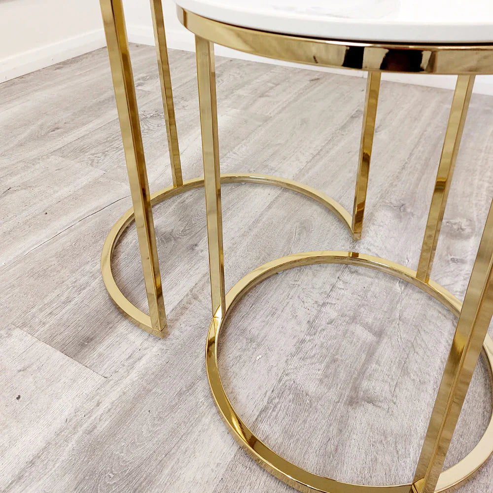 Add a sleek, stylish edge to your living space with the Cato Nest of 2 Tall Gold End Tables. Featuring refined Polar White sintered stone tops set upon slim, round gold metal frames, this set brings sophistication and practicality to your home décor. Whether you're styling a contemporary corner or adding height beside your sofa or bed, these versatile tables deliver both visual appeal and lasting performance.