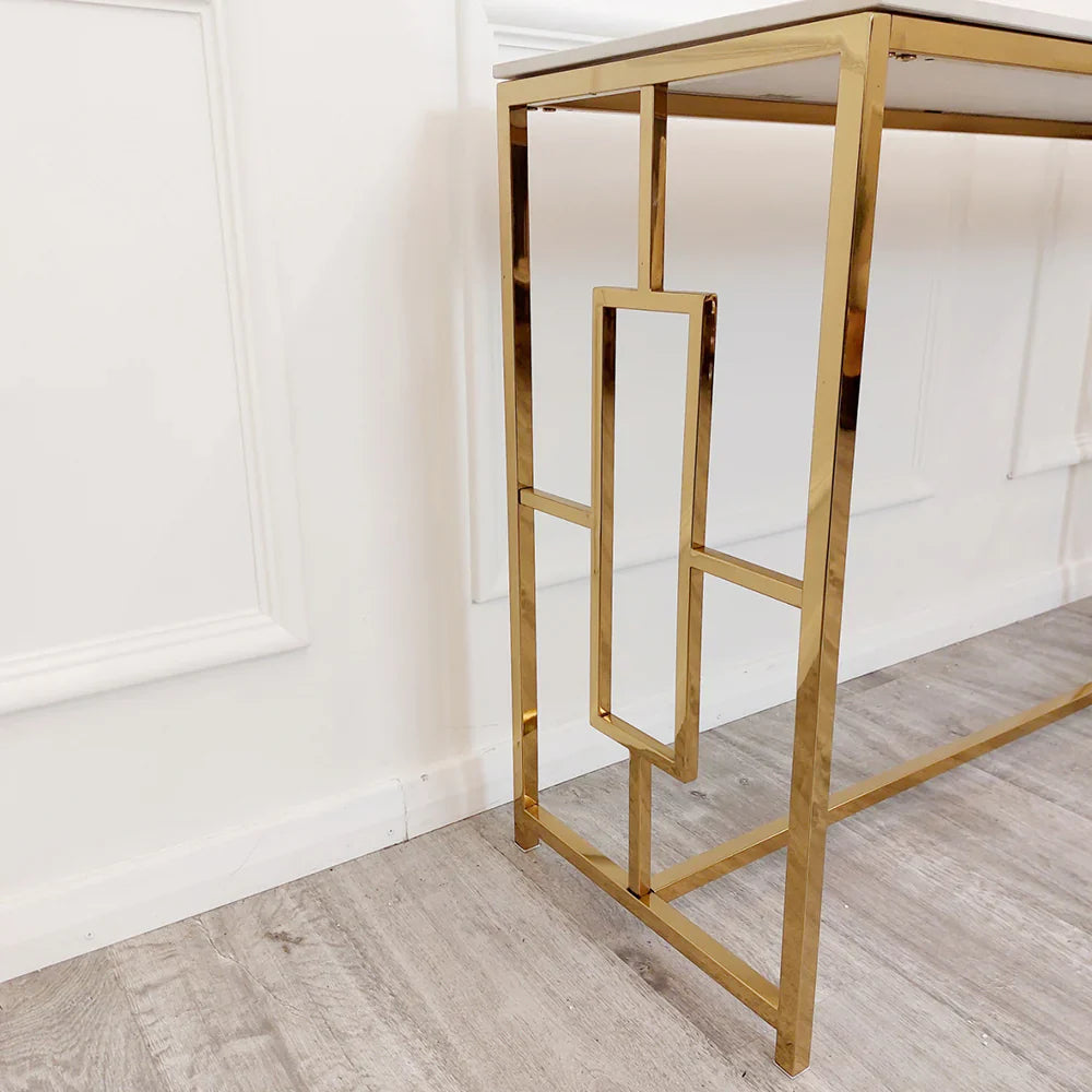Geo Gold Console Table with Polar White Sintered Stone Top – A Bold Statement for Modern Spaces
